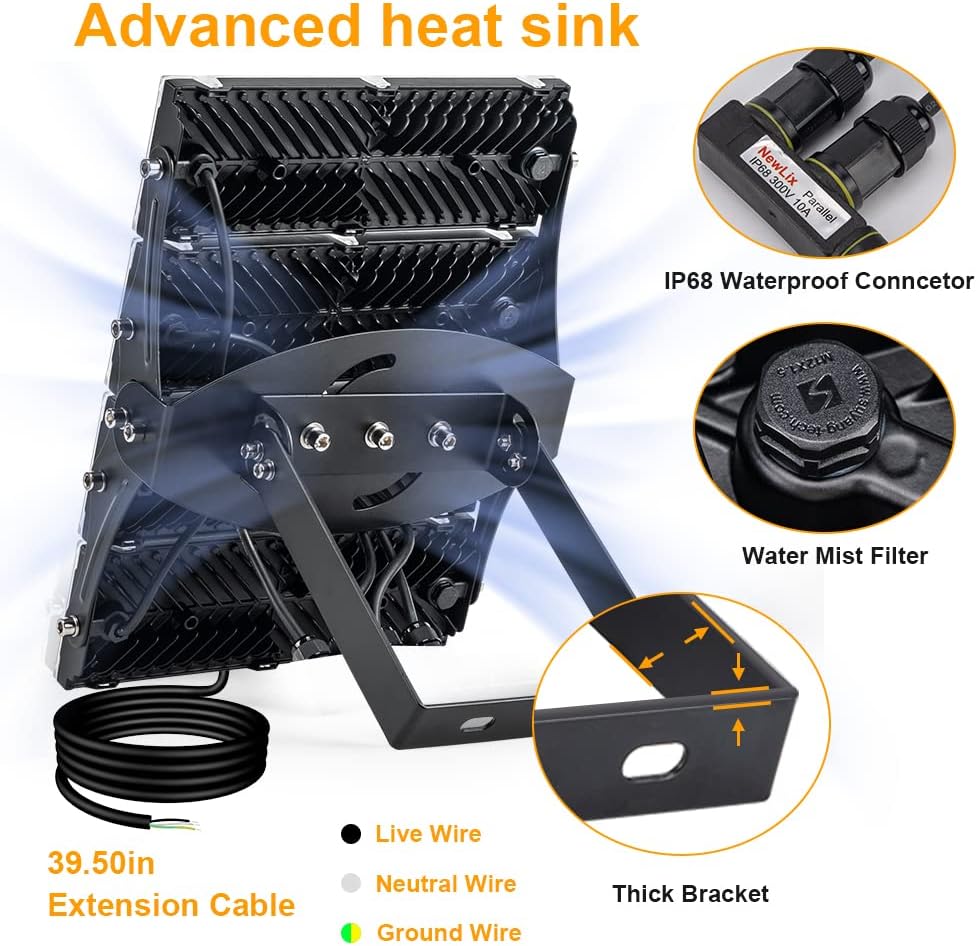 【Excellent lamp body design & IP66 waterproof】Our Floodlight made of robust die-cast aluminum housing structural design is waterproof, with breathing holes.. Therefore our floodlight has IP66 waterproof rating, and the advanced heat dissipation design of the lamp body greatly lifespan. Lifespan(50,000 hours) ten times that of the traditional incandescent lightcan be used in heavy rain and heavy snow extreme weather to ensure your safety lighting.