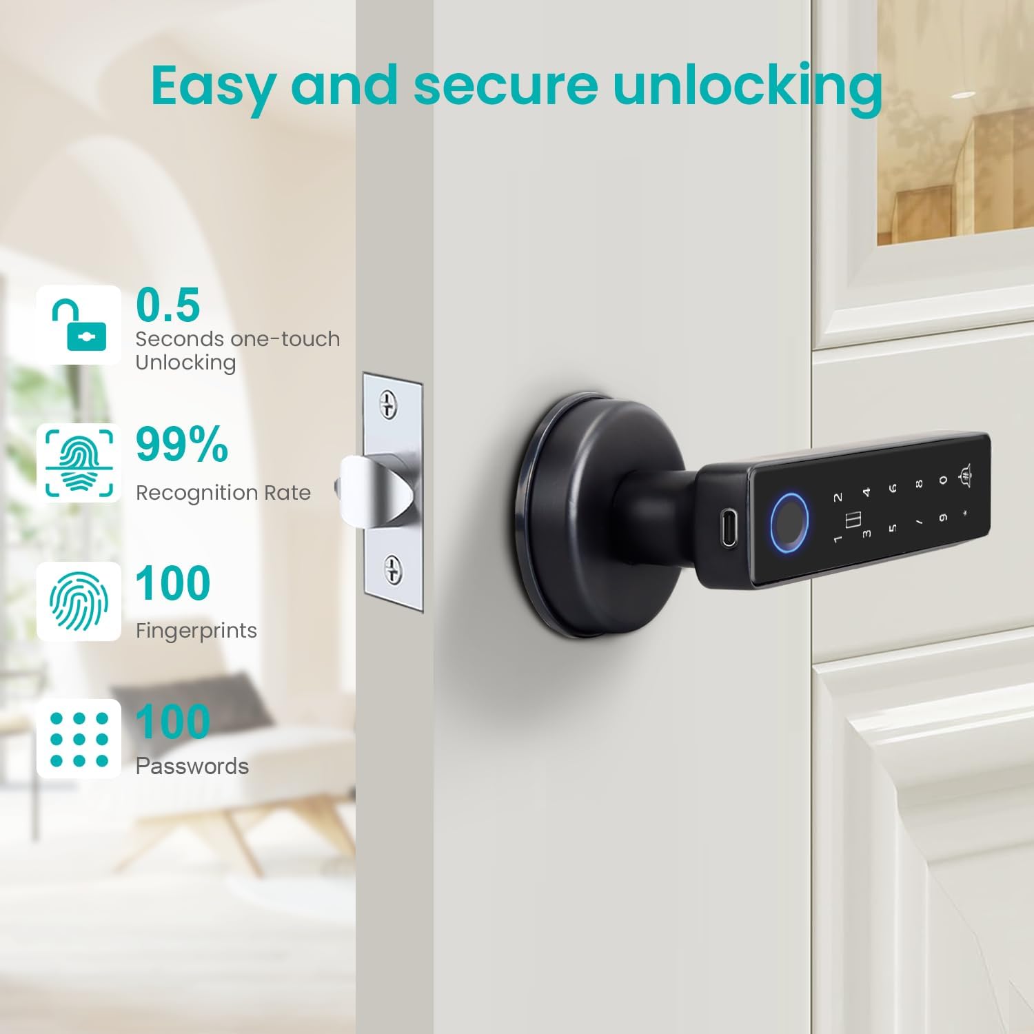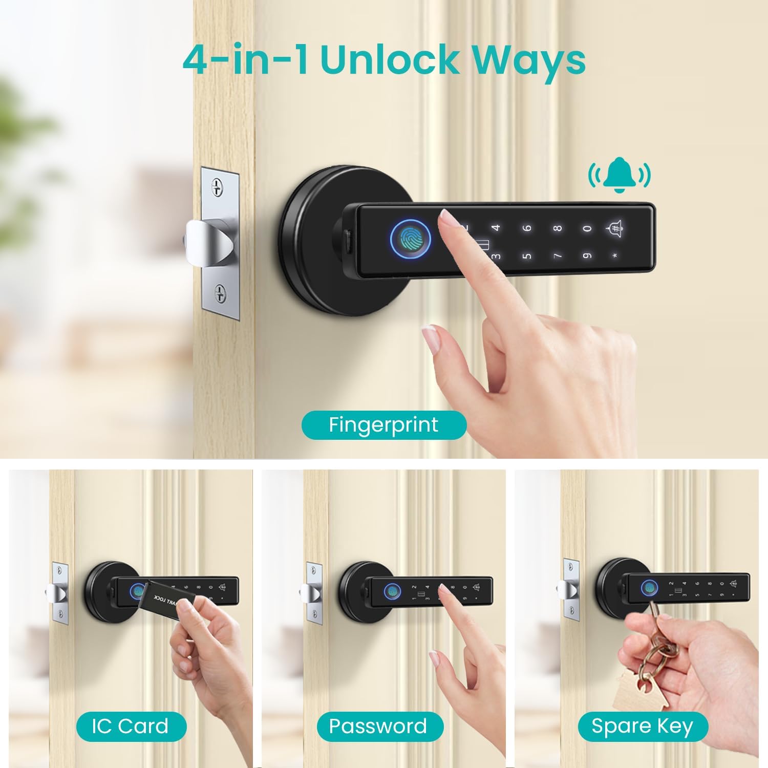 Fingerprint Door Knob, Smart Door Lock with Handle, Keypad Door Lock with Biometric, 4 Unlock Ways: Fingerprint, Passcode, IC Card, Spare Key, Doorbell, 6 Languages for Bedroom, Office, Apartment