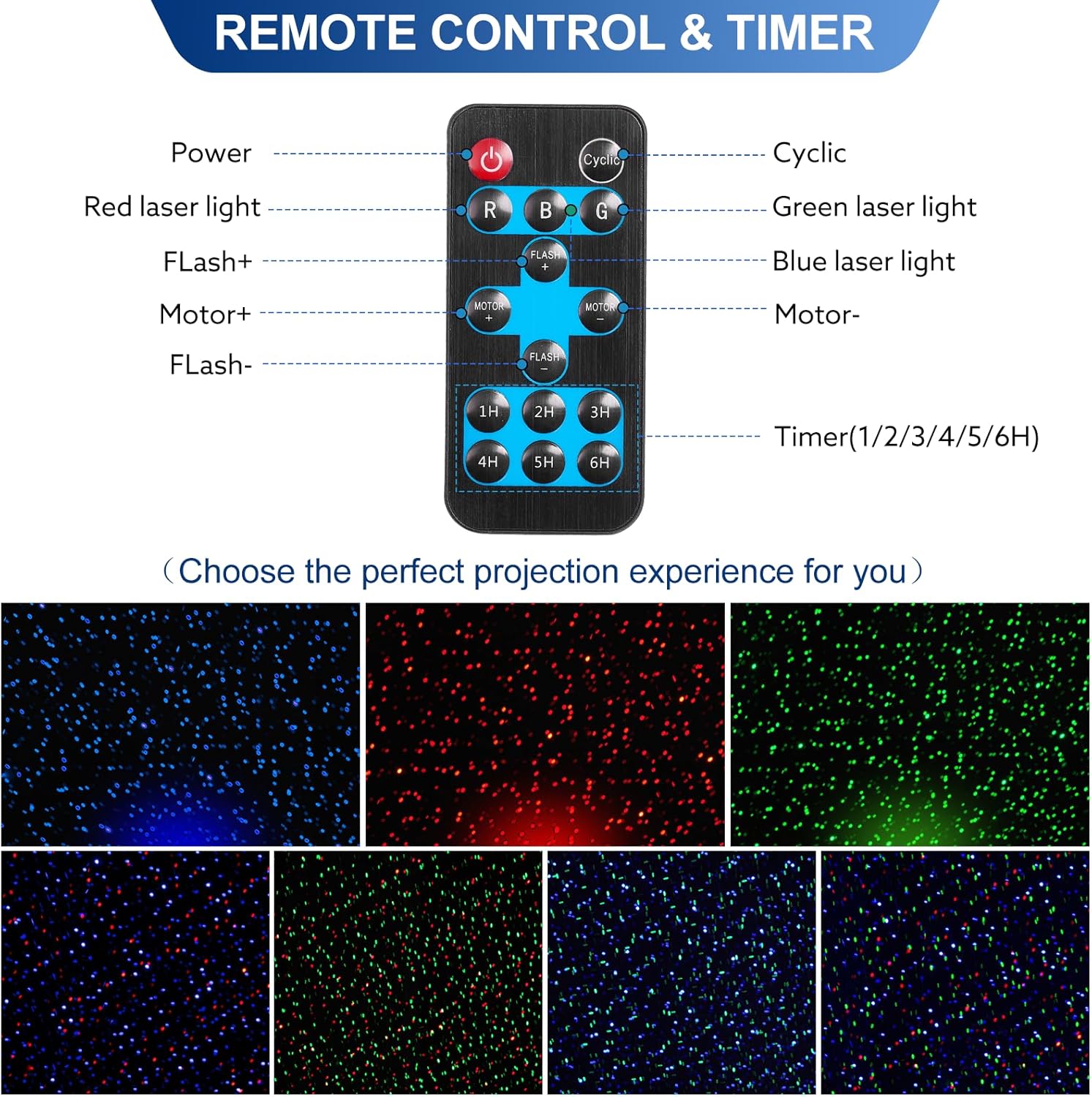 【Convenient Remote Control & Timer】: Take full control of your lighting experience with the included wireless remote! Easily adjust the color selection (RED/GREEN/BLUE), rotation speed (ON/OFF, FLASH+, FLASH-, MOTOR+, MOTOR-), and set the timer (1H/2H/3H/4H/5H/6H) for automatic shut-off. This energy-saving feature ensures environmental protection and eliminates the need for manual operation, making it ideal for holiday decorations, garden parties, and outdoor events.