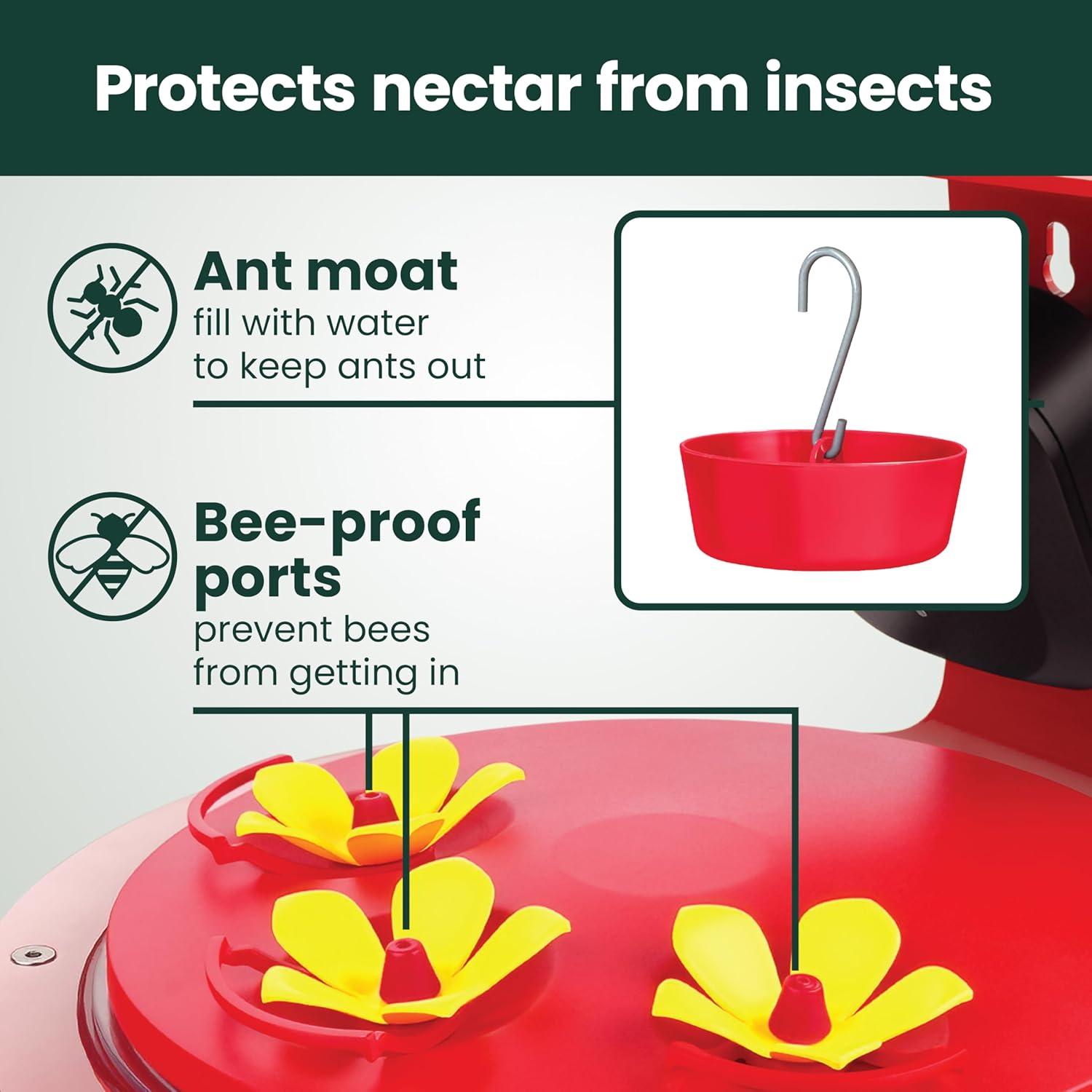 PROTECTS NECTAR FROM INSECTS: The smart hummingbird feeder features bee-proof ports and an ant moat. Three sets of hummingbird-favorite flower colors are included so you can customize the ports for a personalized touch