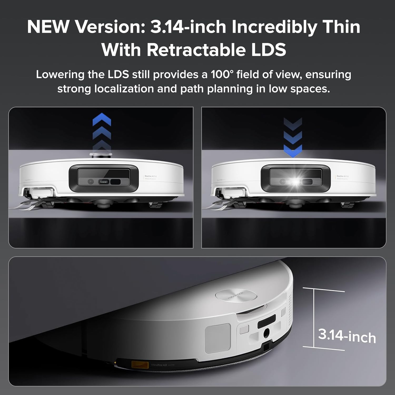 Reach the Unreachable: Featuring a sleek 3.14-inch ultra-thin design, the retractable LDS and RGB camera collaborate for optimal Dirt Detection. The top-mounted ToF sensor smartly adjusts the LDS height, maintaining a 100° viewing angle even in low-light and tight spaces for comprehensive cleaning coverage.