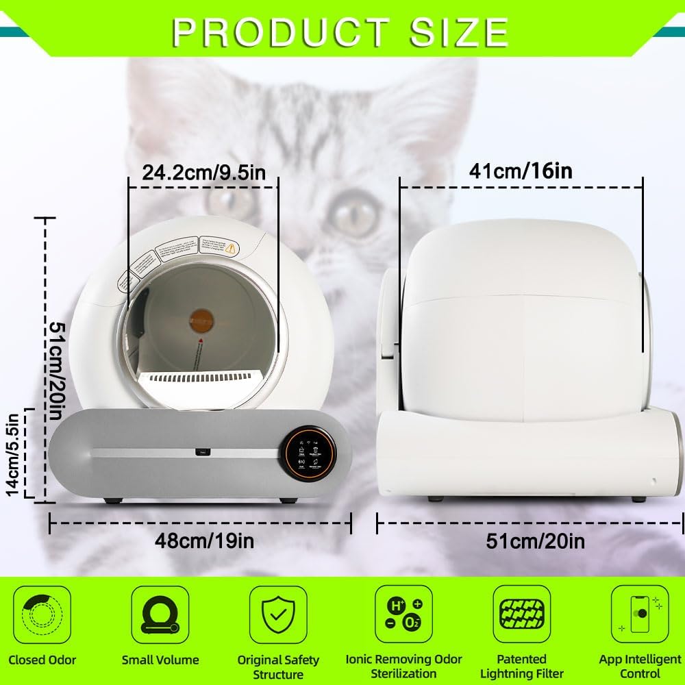 [ODOR-FREE HOME] Innovative negative ion deodorizer uses refrigeration-grade technology to eliminate odors, ensuring a fresh and pleasant home environment for you and your furry friend.One-click replace litter, clean, automatic, and remove odor modes. All old litter can be recovered through using the device’s touch panel or app control to replace with new litter, We recommend cleaning the inside every one to three months.