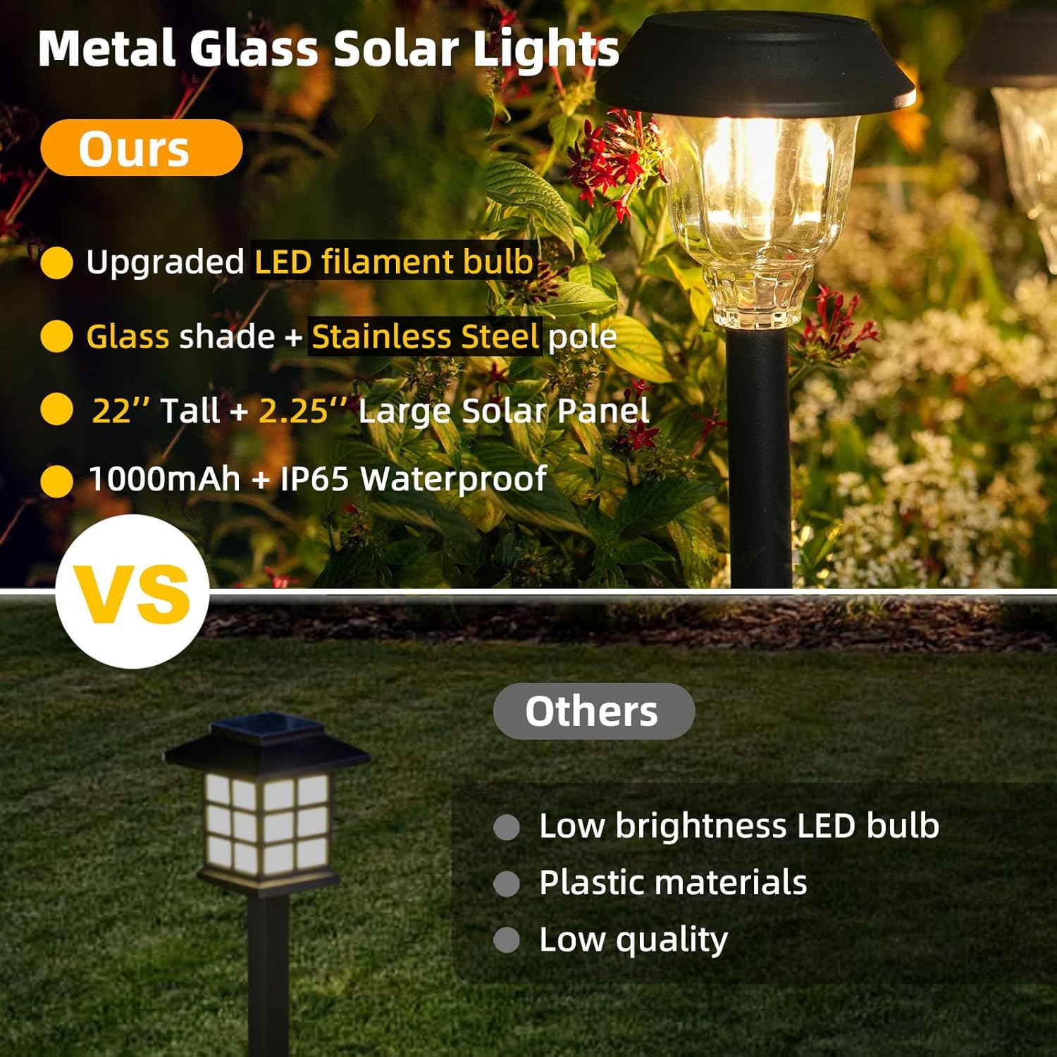 Upgrade Solar Lights Outdoor: Our solar pathway lights filament bulbs emit a warm white light that outshines other solar outdoor lights. The solar garden lights are made of stainless steel with a clear glass light shade that enables you to use this bright solar garden light outdoors durably. Modern substantial textured touch of Metal and Glass quality of this solar power walkway light for garden patio lawn and backyard is much better than solar pathway lights made of plastic.