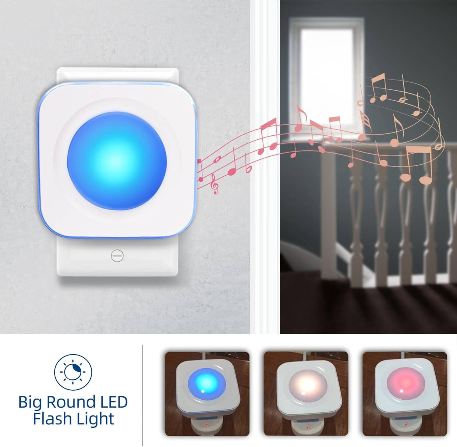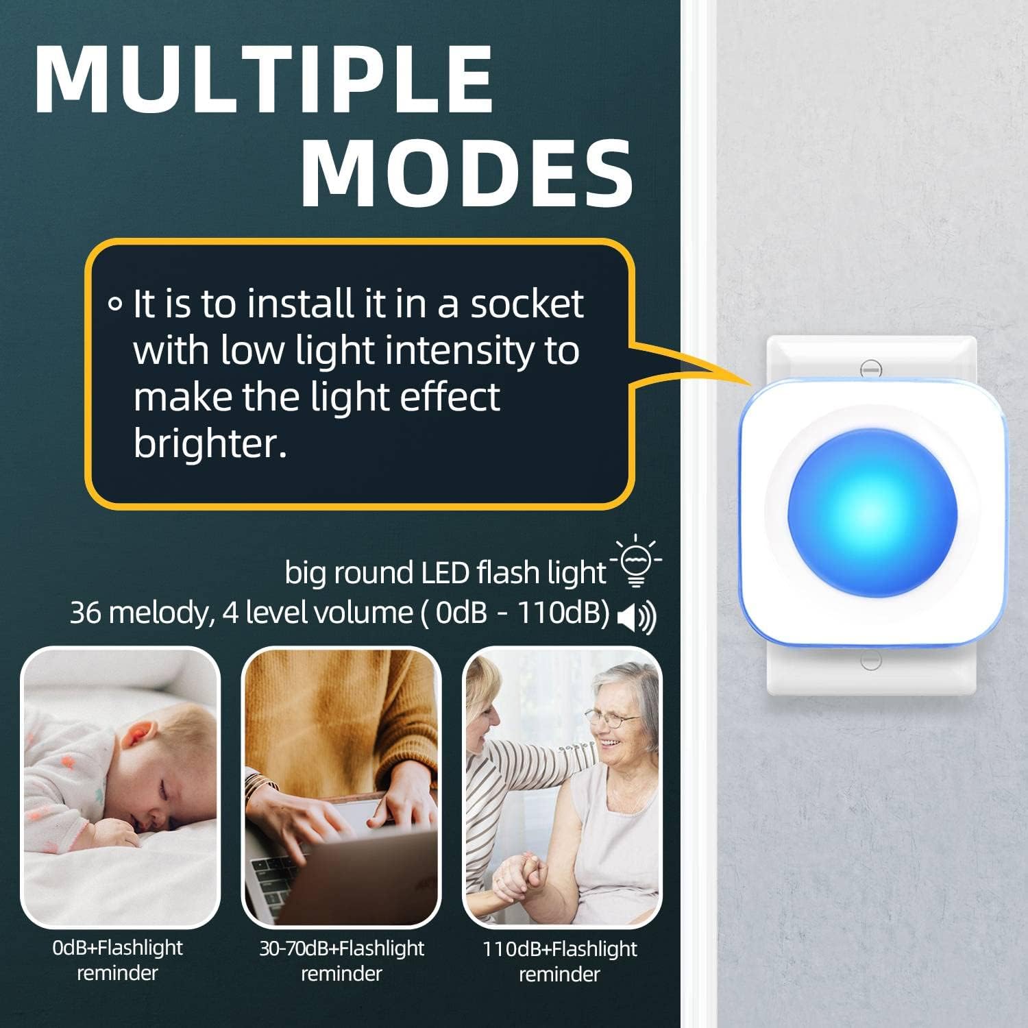 【Flashing Light Doorbell】 The door bell ringer wireless has 36 kinds of music and 4-level volume (0dB-30dB-70dB-110dB), even though it is set to mute mode, the colorful light will be flash ,and can provide extra help for hearing impaired.